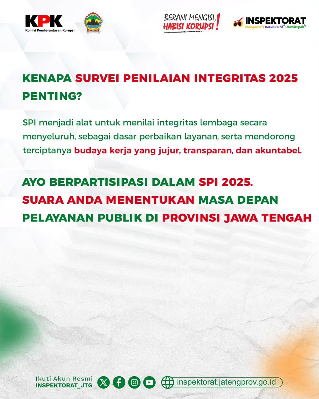 Karena SPI merupakan alat ukur komprehensif untuk menilai integritas lembaga, pondasi kuat untuk perbaikan layanan, dan pendorong terciptanya budaya kerja yang jujur, transparan, dan akuntabel di Jawa Tengah!
